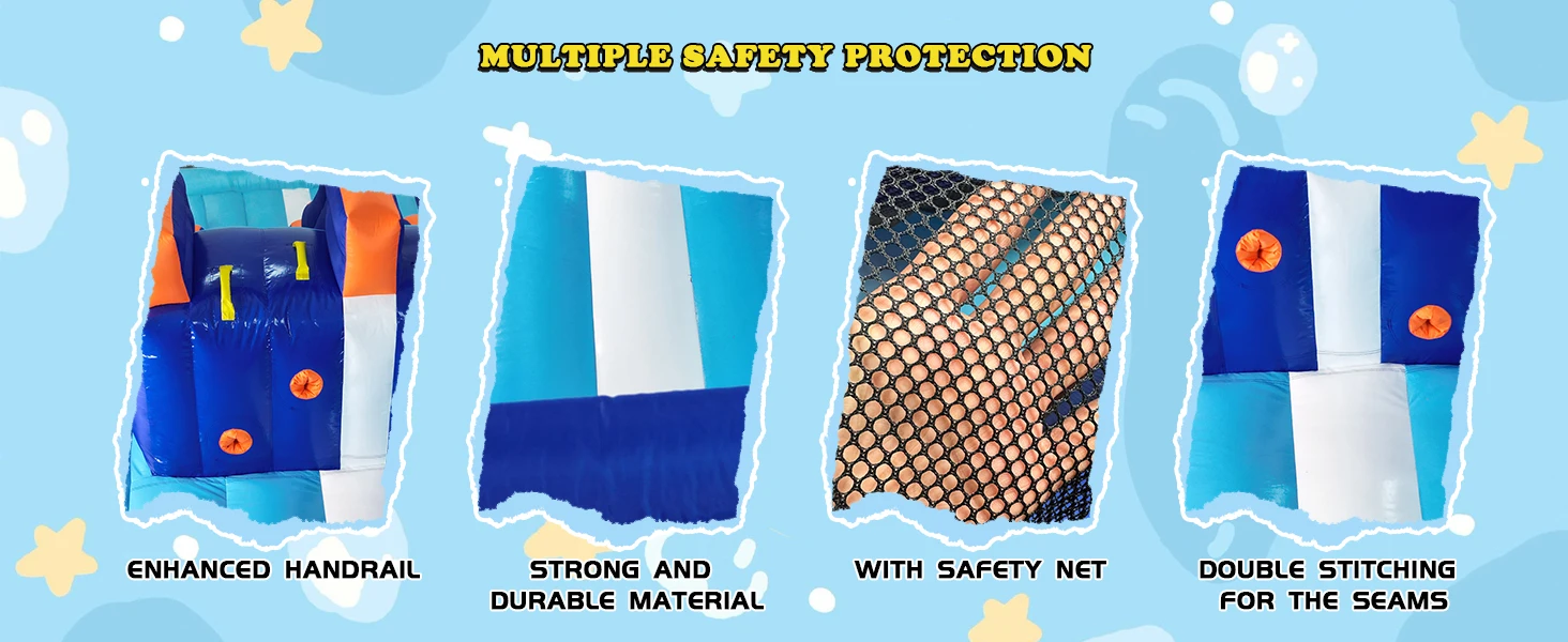【Heavy Nylon and Well Stitched】The material is durable 840 PVC with stronger load-bearing capacity. It is used in places that require stronger load-bearing capacity such as climbing wall and jumping surfaces.Double stitching for the seams and using extra thick fabric to make the bounce house for higher quality,more stronger and durable.